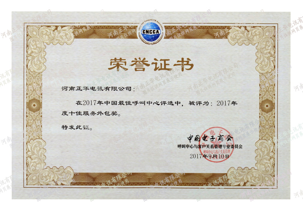 被中國電子商會授予2017年度十佳服務外包獎